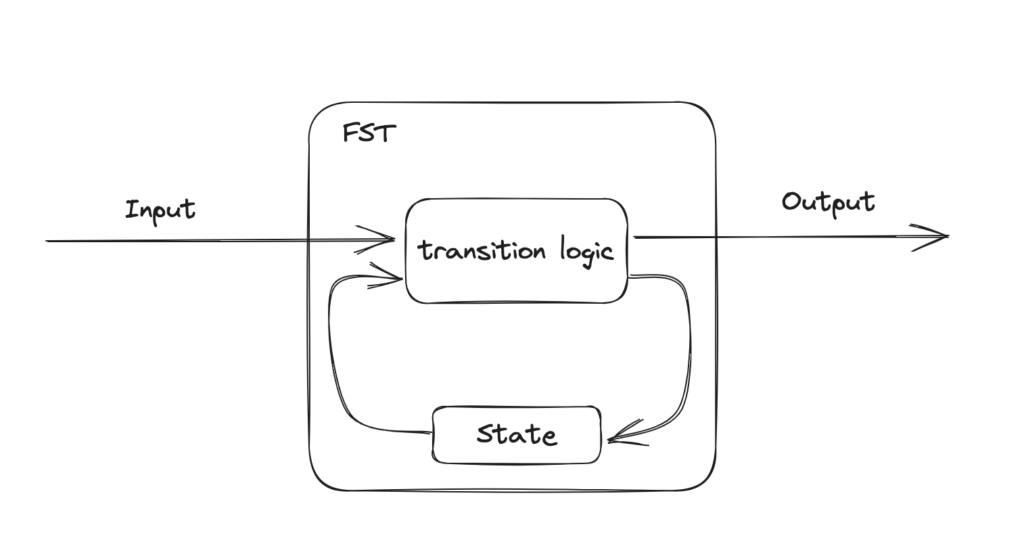 Remember what we brought back from 1955? The signature of an FST transition function is (State, Input) => (State, Output). That's our starting point. For convenience, it may be preferable to produce more than one output element in a single transition, which would be (State, Input) => (State, Sequence<Output>). You may need your FST to work on mutable state, so you may actually use (State, Input) => Output. You may end up encapsulating your state inside the transition function or its owner, and use Input => Output.