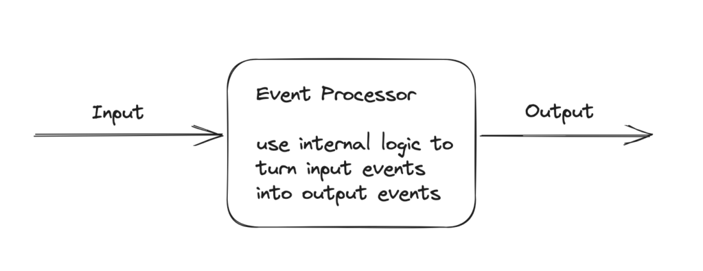 An Event Producer produces events. They are the source of input into the system. An Event Consumer consumes events. They take output out of the system. In between them sits one or more Event Processor nodes. They accept events from producers and send other events to consumers. We could illustrate that like this: