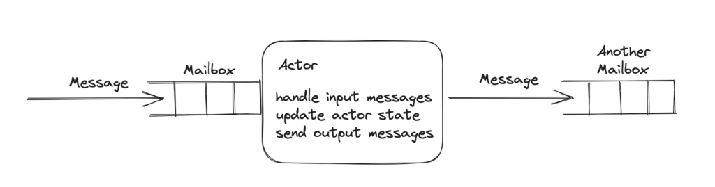 In an Actor Model, an Actor consists of a Mailbox, which is a queue of messages, a function to process a message, and some internal state. Actors may communicate with other actors by putting messages into their mailboxes. As an actor, messages in my mailbox are input, and messages I send to other actors are output.