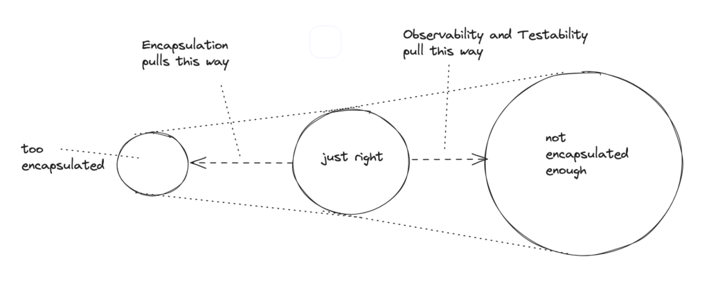 Encapsulation encourages us to hide details and have a smaller interface. Testability encourages us to expose enough detail so that we can verify behaviors. Observability encourages us to expose enough detail so that we can understand what our system is doing. At one extreme, we encapsulate so much that we can't verify the module performs as expected, and we can't analyze or optimize its performance. That is bad. At the other extreme, we expose so much, that anyone who wants to use the module has to learn all of its details. Those details may end up littered throughout the system because they are easy to get to, making our system harder to change. That is also bad.